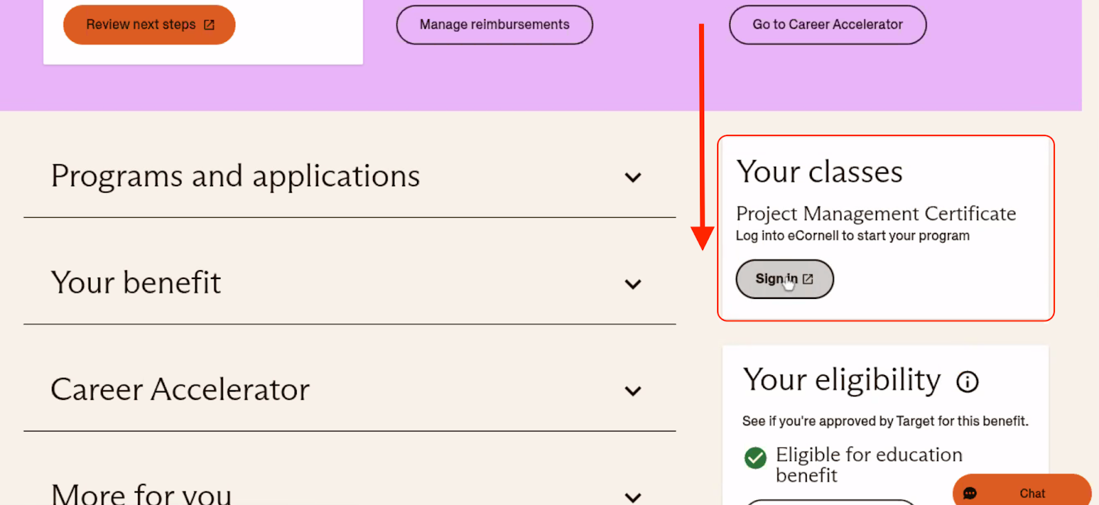 - Once you are in your Guild account, scroll down and look for the "Your classes" area. Here, you should see the title of the certificate you requested. Log in if you have not yet done so.