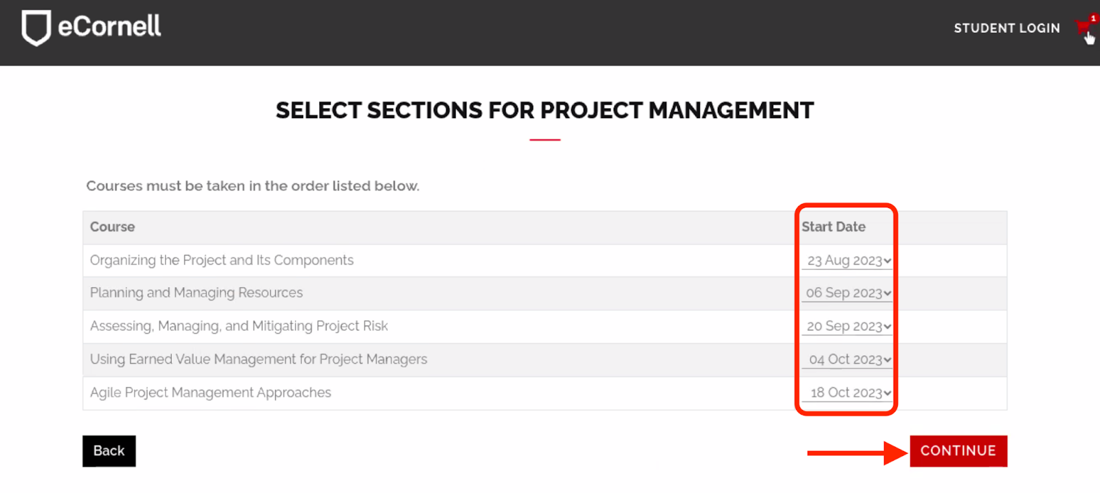 - After logging in, you will be redirected to the eCornell site, where you will be prompted to select start dates for each of the individual courses that are part of your program. Note that the system will automatically suggest dates, but you can adjust these by clicking each dropdown menu. eCornell recommends taking one course at a time for the best student experience. Once you are satisfied with the schedule, click Continue.