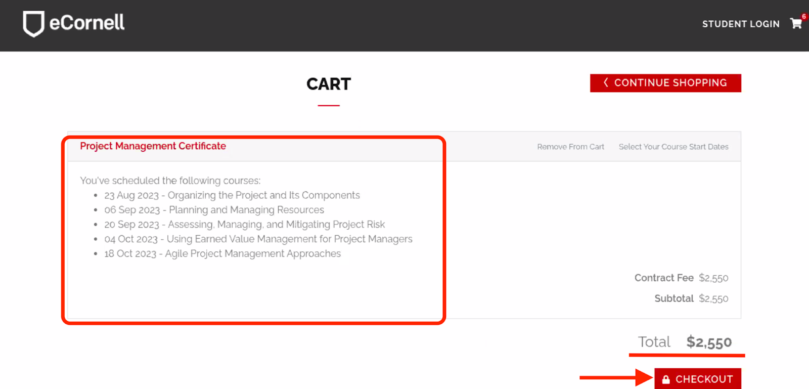 Note: If your program requires a specific order, this will be noted at the top of the list. Most programs do not require a specific order. - On the next page, you will see your cart, which will include the name of your program and your chosen schedule. Here, you will see the full cost of the program, regardless of your funding. Click Checkout to continue.