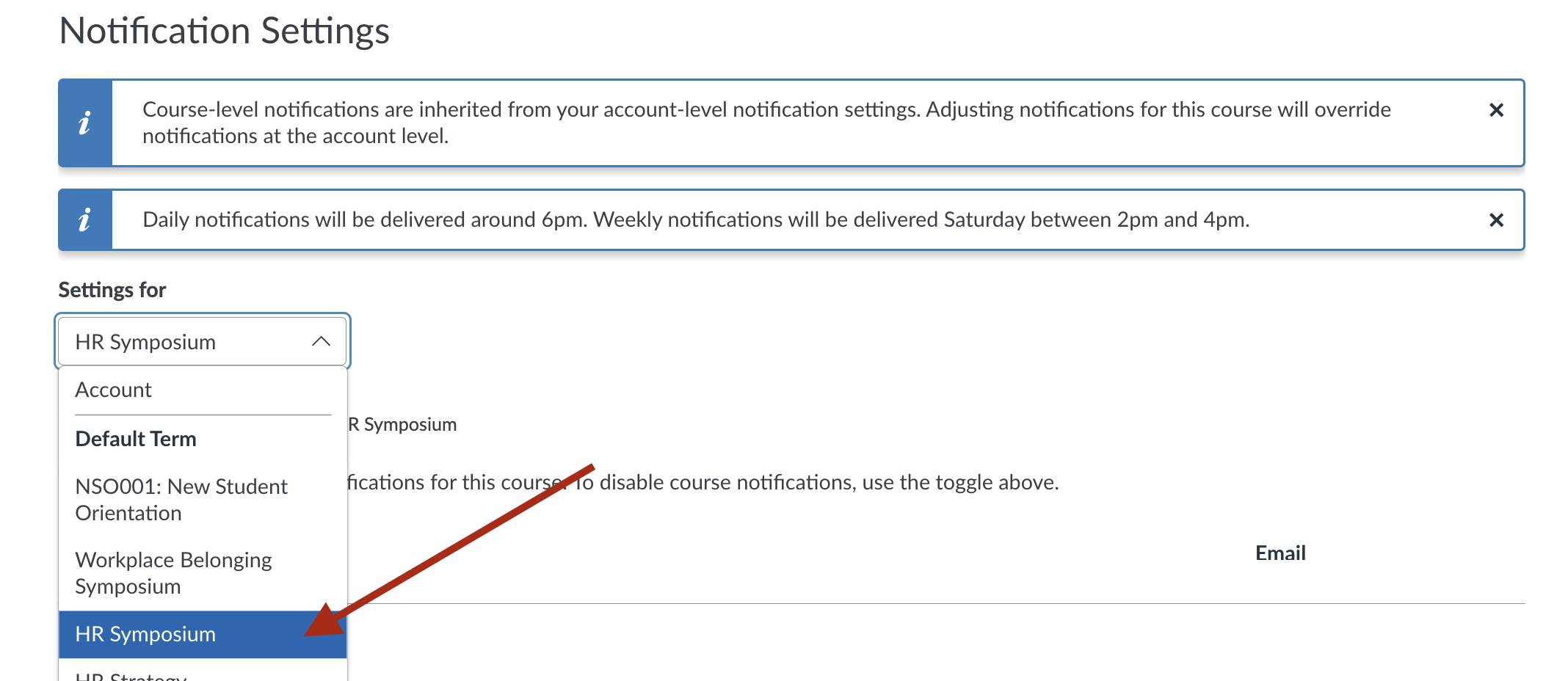 You can adjust your general notification settings at any time by following the steps below. After your first course becomes available at 9 am ET on the course start date, you can set up and control the frequency of notifications for individual courses. Follow these steps to configure the notification frequency: