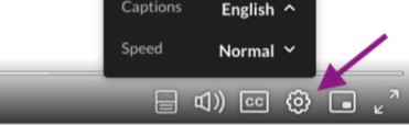 - For caption language: click the gear icon near the bottom right corner in the video player. Under the “Caption" menu, choose your language for captions.