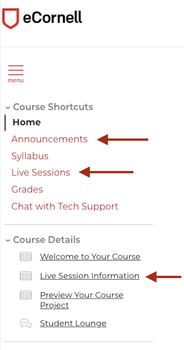 - Course Modules: Some courses include a module labeled “Live Session.” Click into that section to find the date, time, and Zoom link.